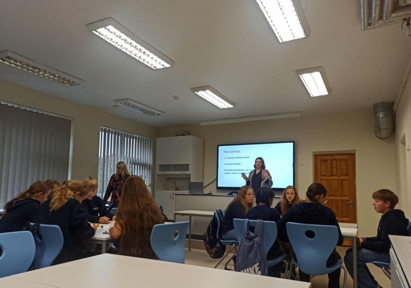veikloje mokiniai lavino pažinimo, kūrybiškumo kompetencijas, tobulino kalbinius bei bendradarbiavimo įgūdžius. Džiaugiamės galėdamos glaudžiai bendradarbiauti, kurti bendrus planus ir suteikti mokiniams dvigubą naudą – galimybę vienu metu mokytis dviejų dalykų. Pamoka vyko atnaujintame chemijos biologijos kabinete-laboratorijoje.